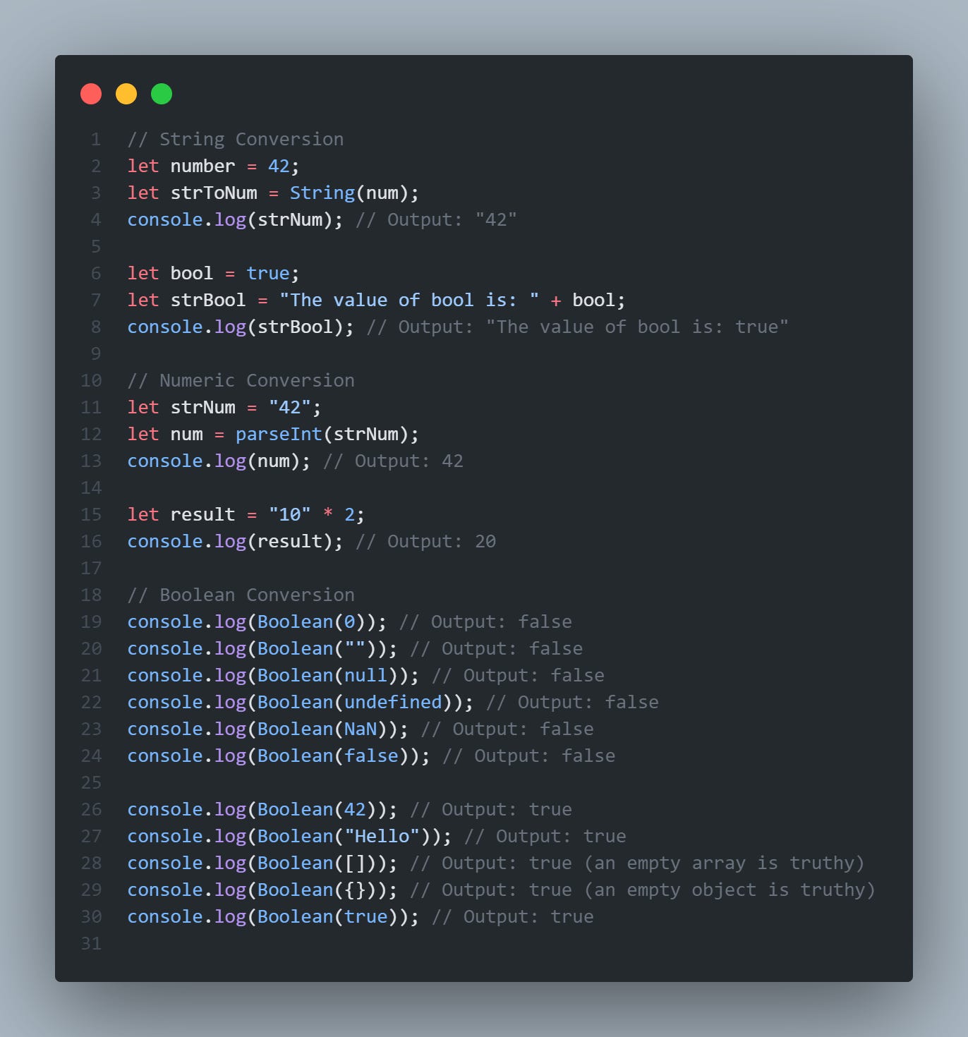Understanding type conversions in JavaScript is essential for writing clear and predictable code. Whether you're explicitly converting types using functions like String() or parseInt(), or relying on implicit conversions in various contexts, being aware of how JavaScript handles different data types will help you avoid unexpected behavior and write more robust applications.